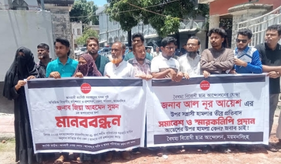 ময়মনসিংহে সাংবাদিক কামাল’র বিরুদ্ধে মিথ্যা মামলা প্রত্যাহারের দাবিতে মানববন্ধন অনুষ্ঠিত